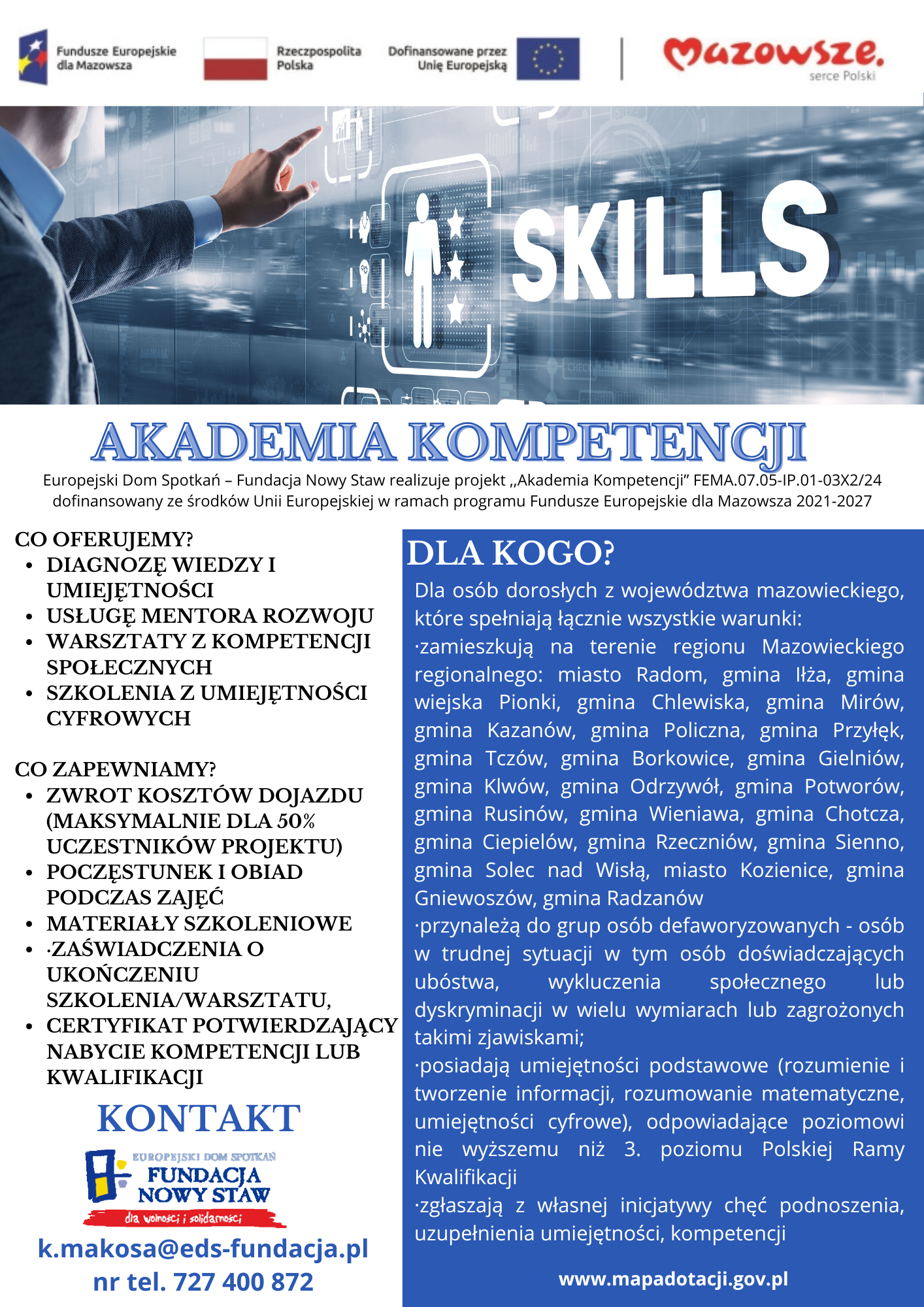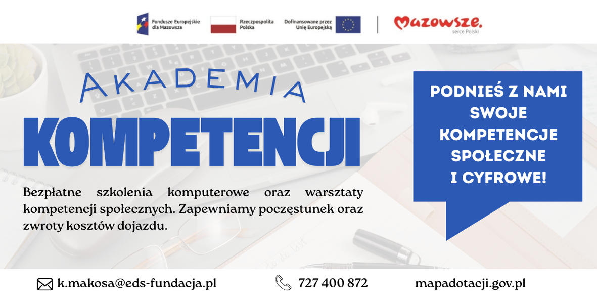 Więcej informacji o projekcie Akademia Kompetencji : pod nr tel. 727 400 872 lub mailowo na k.makosa@eds-fundacja.pl